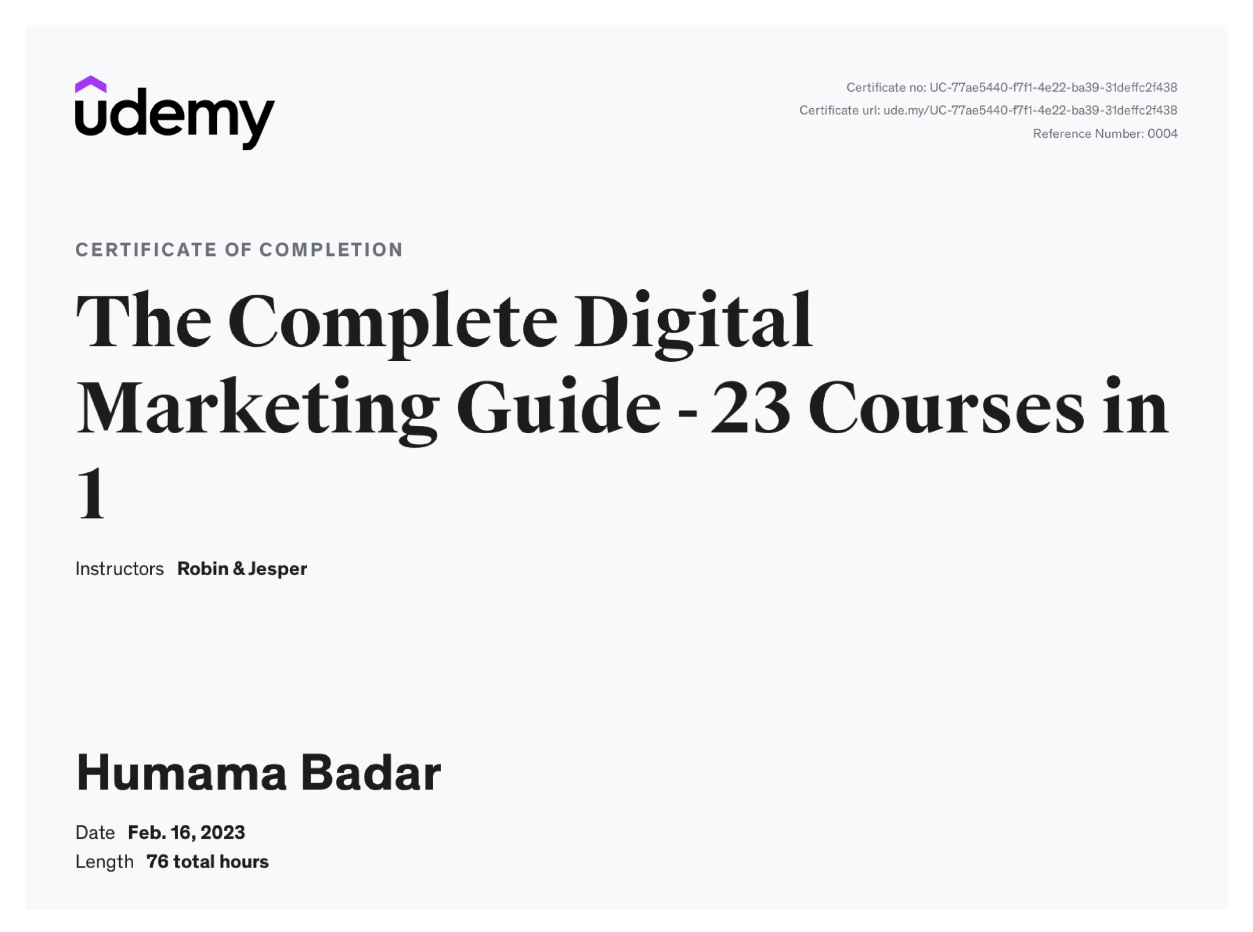 Certified in The Complete Digital Marketing Guide – 23 Courses in 1 on Udemy, taught by Robin & Jesper.
