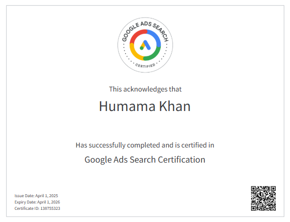 Certified in creating and optimizing Google Search campaigns using Smart Bidding solutions.
