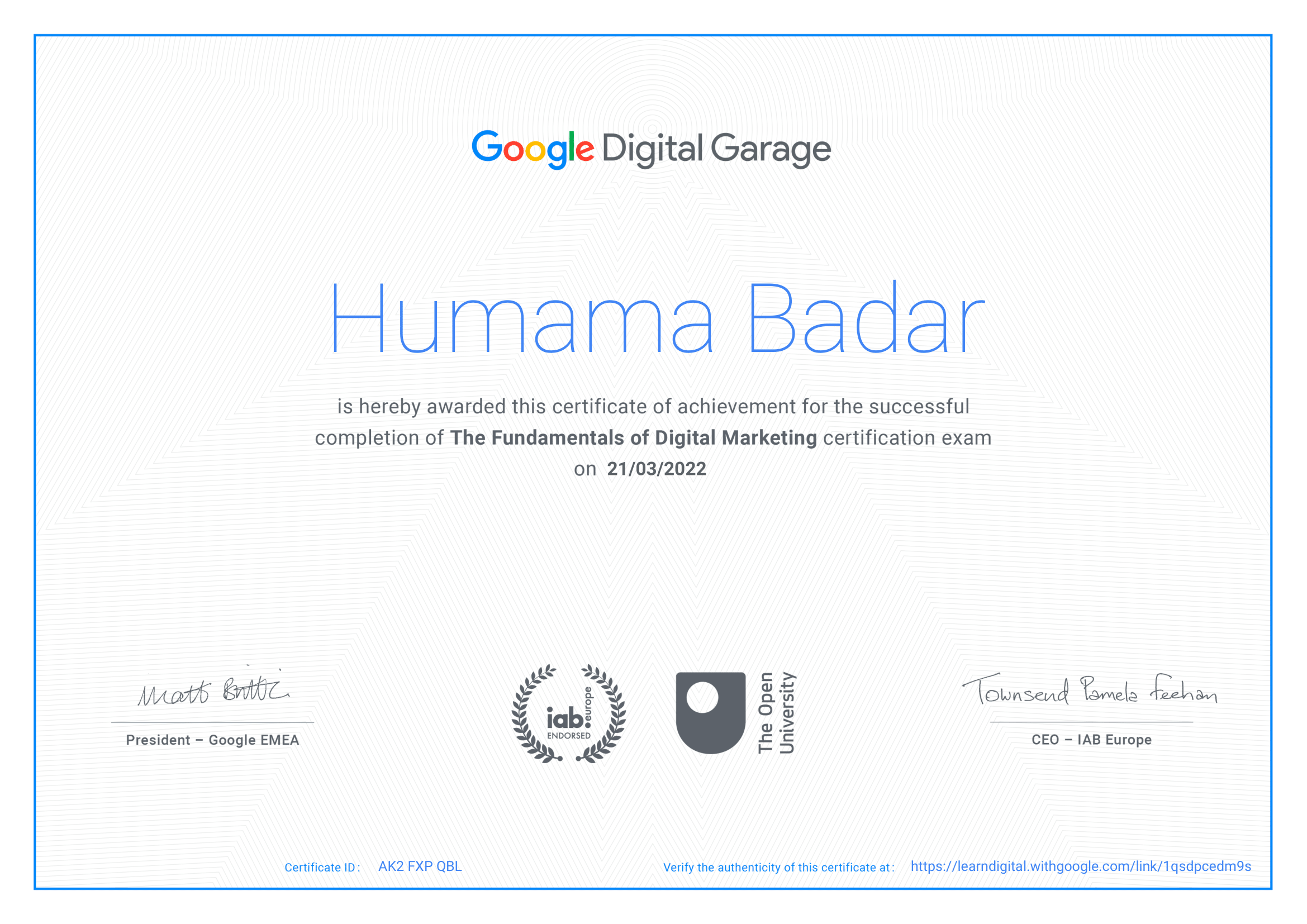 Certified in The Fundamentals of Digital Marketing by Google Digital Garage, in partnership with The Open University and IAB Europe.